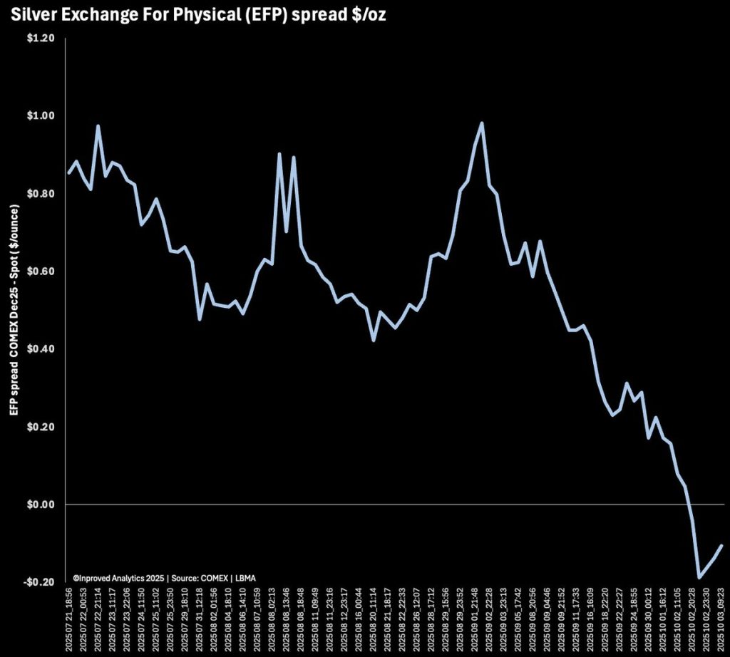 That squeeze dynamic may already be underway. The EFP (Exchange for Physical) spread — a measure of the price differential between futures and spot markets — has shrunk to just 0.156 cents per ounce, down from 64 cents two weeks ago. A tightening EFP often coincides with vault outflows or delivery stress, suggesting demand for conversion from paper to metal is accelerating.