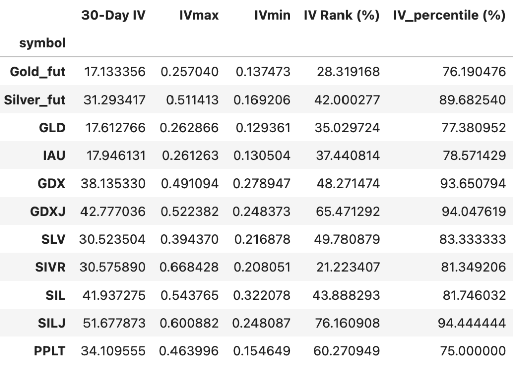 Among miners, the GDXJ (junior miners ETF) has the most explosive setup, with IV rank above 65% and IV percentile at 94%, reflecting traders’ expectation of amplified moves in smaller-cap producers — typically the first beneficiaries of a sustained rally.