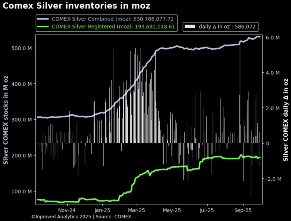 Silver’s story in 2025 is one of paradoxes: record inventories alongside record scarcity, shrinking EFPs amid swelling vaults, and rising volatility without fear. The market isn’t breaking — it’s repricing the cost of real metal in a world addicted to derivatives.